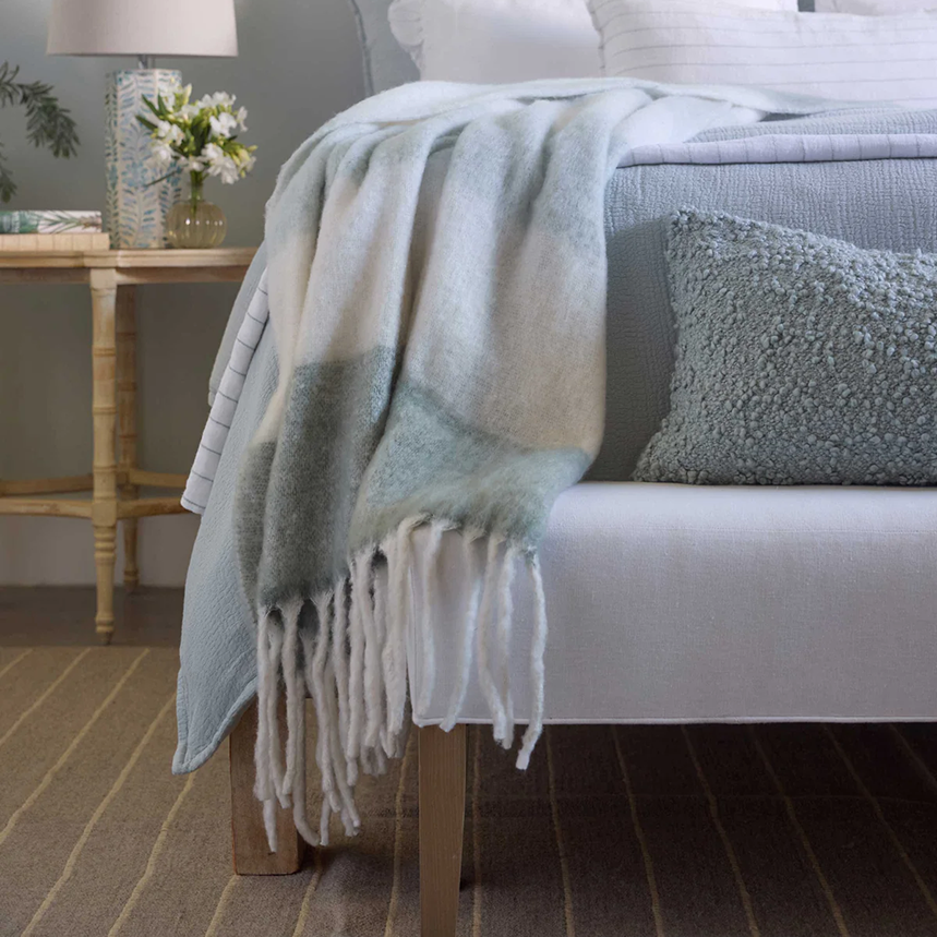 A soft, elevated throw with relaxed texture and timeless appeal. The Whistler Throw pairs a classic knit with moss-toned yarns for a layered, inviting feel—perfect for draping over sofas, chairs, or the foot of the bed to add warmth and effortless style.