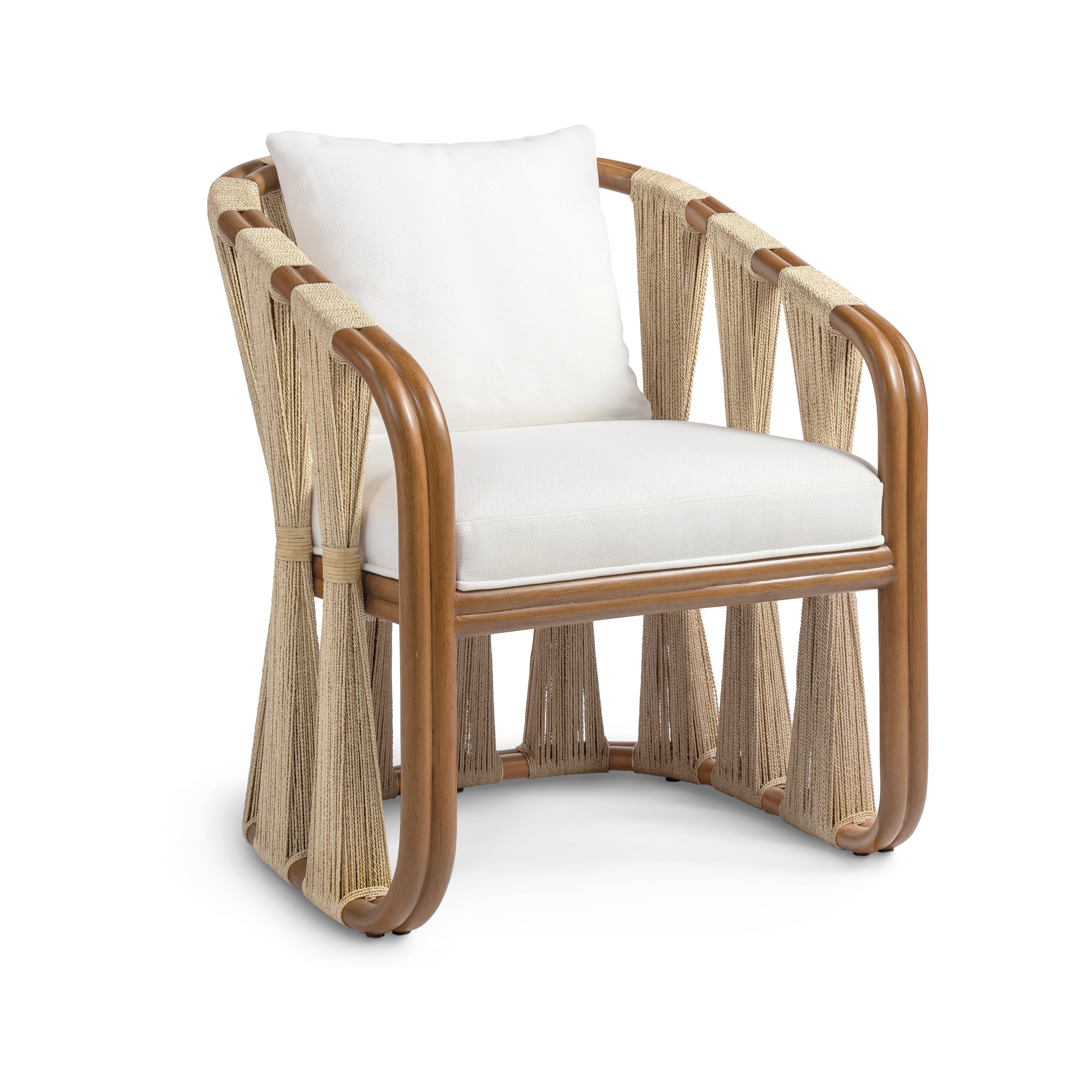 The Larett Arm Chair brings effortless coastal texture to any living space with its beautifully crafted large-gauge rattan frame and natural finish. Bundled natural abaca rope detailing along the sides and back adds a handcrafted, collected feel, while the fixed upholstered seat and loose back cushion keep it comfortable and lounge-worthy. With its airy silhouette and organic materials, this chair is the perfect accent for a living room, bedroom corner, or styled reading nook—adding warmth, dimension, and relaxed sophistication.