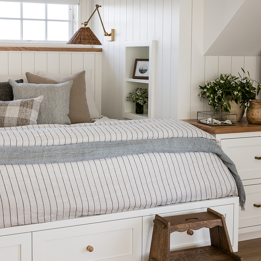 The emotional heart of the home, this is a space to retreat and reset. Vaulted oak ceilings and a neutral palette create a sense of calm and continuity. Linen bedding, sun-washed tones, and sculptural lighting invite stillness, while the adjoining bath continues the story in stone, plaster, and patinated brass.